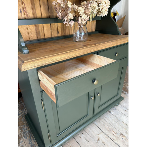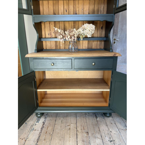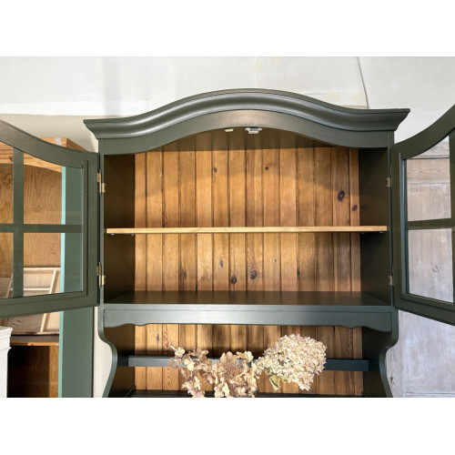 Sügavat rohelist tooni vitriinkapp. Kapp on värvitud Wise Owl mööblivärviga, toon Dark Forest, pruunid osad vahatatud.