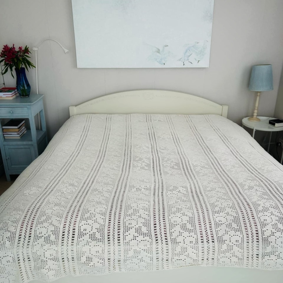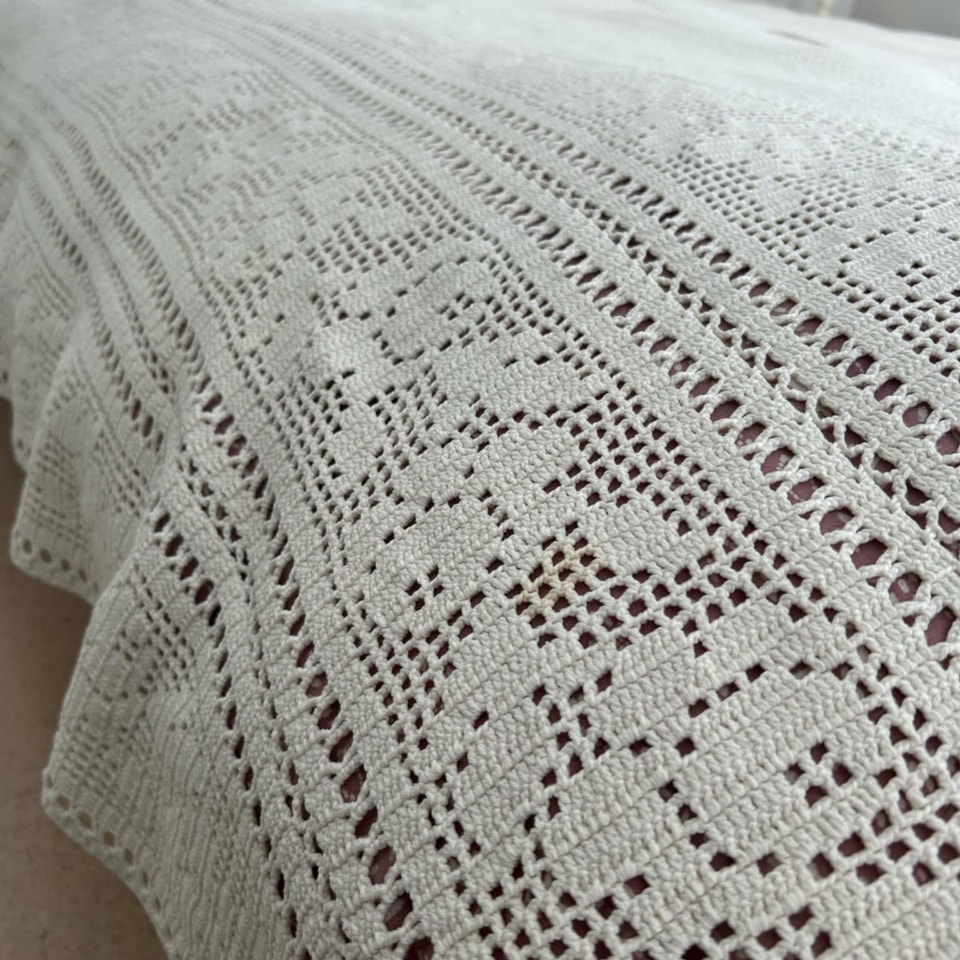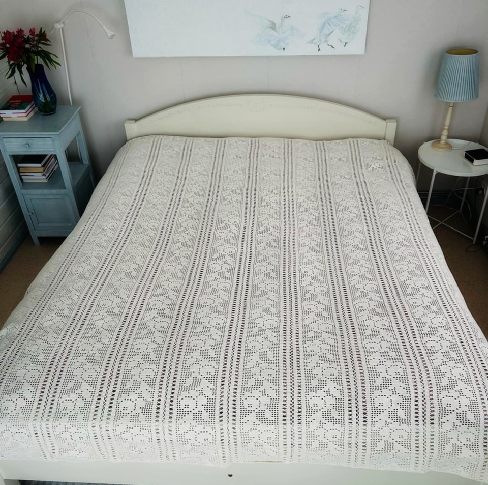 Käsitööna valminud voodikate on kasutatud, aga heas korras.
